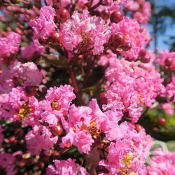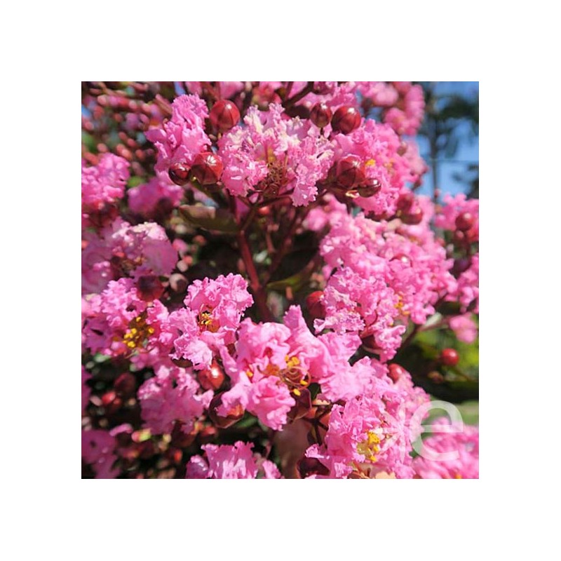 *"Magnifique arbuste caractéristique du sud ouest à floraison spectaculaire estivale rose s'appuyant sur un feuillage pourpré, virant à l'orange à l'automne".